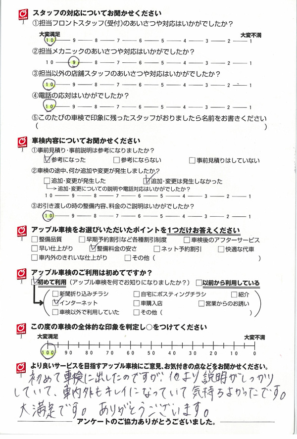 お客様の声 より良いサービスを追求しお客様の笑顔が集まる店を目指します ホーム > お客様の声 ”女の私にもわかりやすい親切な説明をありがとうございました。” ”車検の安さ、アフターサービスを踏まえ今後もアップル車検を利用したいです。” ”車検前の見積り説明がくわしいので良かった” ”スタッフの皆さん、とても親切であいさつがとても印象に残りました。” ”初めて車検に出したのですが、他より説明がしっかりしていて、社内外もキレイになっていて気持ちよかったです。大満足です。ありがとうございます。” ”ボンネットをあけて、整備状態を説明してくれたのが良かったです。” ”受付の方及び整備の方の対応が良く安心してまかせられます。これ以上にがんばって下さい。” ”全体 大変満足しています”